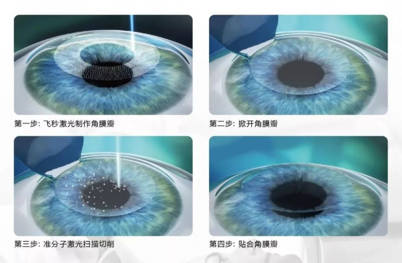 半飞秒手术需要两台设备协作:先用飞秒激光制作一个约20毫米的角膜瓣,掀开角膜瓣后,再用准分子激光进行角膜基质切削,最后将角膜瓣复位。这种术式矫正范围广(可矫正近视、远视、散光),视觉质量优异,且保留了角膜上皮层,术后疼痛感轻、视力恢复迅速。因为存在角膜瓣,术后需注意避免眼部受到外力撞击,以防发生瓣移位等风险。